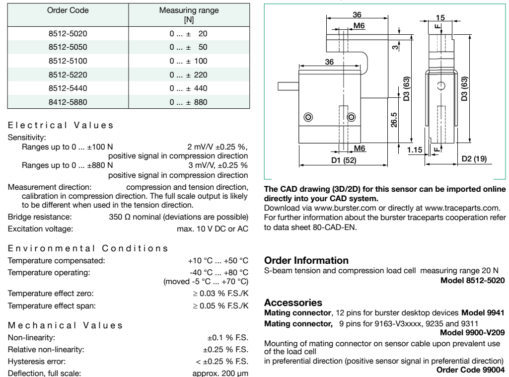 Model 8402: 8402-6001:0-1 kN ;8402-6002:0-2 kN ;8402-6005:0-5 kN ;8402-6010:0-10kN;8402-6020:0-20kN;8402-6050:0-50kN ;8402-6100:0-100kN;Model 8415: 8415-5200:0-200N 2.0kHz(諧振頻率);8415-5500:0-500N 4.0kHz(諧振頻率);8415-6001:0-1000N 6.5kHz(諧振頻率);8415-6002:0-2000N 10.5kHz(諧振頻率);8415-6005:0-5000N 20.0kHz(諧振頻率);Model 8416: 8416-5100:0-100N 6kHz(頻率);8416-5200:0-200N 20kHz(頻率);8416-5500:0-500N 18kHz(頻率);8416-6001:0-1000N 30kHz(頻率);8416-6002:0-2000N 45kHz(頻率);8416-6005:0-5000N 80kHz(頻率);Model 8417: 8417-5500:0-500N ;8417-6001:0-1000N ;8417-6002:0-2000N ;8417-6005:0-5000N;Model 8431: 8431-5:0-5N 0.5kHz(諧振頻率);8431-10:0-10N 1.8kHz(諧振頻率);8431-20:0-20N 2.0kHz(諧振頻率);8431-50:0-50N 5.7kHz(諧振頻率);8431-100:0-100N 6.5kHz(諧振頻率);8431-200:0-200N 13.8kHz(諧振頻率);8431-500:0-500N 20.5kHz(諧振頻率);8431-1000:0-1kN 21.0kHz(諧振頻率);8431-2000:0-2kN 23.9kHz(諧振頻率);8431-5000:0-5kN 50.0kHz(諧振頻率);8431-10000:0-10kN ;8431-20000:0-20kN ;8431-40000:0-40kN;Model 8432: 8432-2.5:0-2.5N 0.1kHz(諧振頻率);(過(guò)載保護(hù)) 8432-5: 0-5N 0.5kHz(諧振頻率);8432-10: 0-10N 1.8kHz(諧振頻率);8432-20: 0-20N 2.0kHz(諧振頻率);8432-50: 0-50N 5.7kHz(諧振頻率);8432-100:0-100N 6.5kHz(諧振頻率);8432-200:0-200N 13.8kHz(諧振頻率);8432-500:0-500N 20.5kHz(諧振頻率);8432-1000:0-1kN 21.0kHz(諧振頻率);8432-2000:0-2kN 23.9kHz(諧振頻率);Model 8435: 8435-5200:0-200N 5,0kHz(頻率);8435-5500:0-500N 9,0kHz(頻率);8435-6001:0-1000N 14,0kHz(頻率);8435-6002:0-2000N 18,0kHz(頻率);8435-6005:0-5000N 22,0kHz(頻率);Model 8438: 8438-5005:0-5N;8438-5010:0-10N;8438-5020:0-10N;8438-5050:0-50N;8438-5100:0-100N;8438-5200:0-200N;8438-5500:0-500N;8438-6001:0-1kN;8438-6002:0-2kN;8438-6005:0-5kN;8438-6010:0-10kN;8438-6020:0-20kN;8438-6050:0-50kN;8438-6100:0-100kN;8438-6200:0-200kN;Model 8451: 8451-5500:0-0.5kN ;8451-6001:0-1kN ;8451-6002:0-2kN ;8451-6005:0-5kN ;8451-6010:0-10kN ;8451-6020:0-20kN;3.Load Cells in various designs;Model 8510: 8510-5001:0-1N 5N(Overload protection) ;8510-5002:0-2N 10N(Overload protection) ;8510-5005:0-5N 15N(Overload protection) ;8510-5010:0-10N 20N(Overload protection) ;8510-5020:0-20N 40N(Overload protection);Model 8511: 8511-5005:0-±5N ;8511-5010:0-±10N ;8511-5020:0-±20N ;8511-5050:0-±50N ;8511-5100:0-±100N ;8511-5200:0-±200N ;8511-5500:0-±500N ;8511-6001:0-±1000N ;8511-6002:0-±2000N;Model 8523: 8523-20:0-20N;8523-50:0-50N;8523-100:0-100N;8523-200:0-200N;8523-500:0-500N;Model 8531: 8531-1000:0-1000N;8531-2000:0-2000N;8531-5000:0-5000N;Model 8524: 8524-5500:0-±0.5kN ;8524-6001:0-±1kN ;8524-6002:0-±2kN ;8524-6005:0-±5kN ;8524-6010:0-±10kN ;8524-6020:0-±20kN ;8524-6050:0-±50kN ;8524-6100:0-±100kN ;8524-6200:0-±200kN;Model 8526: 8526-5100:0-100N ;8526-5200:0-200N ;8526-5500:0-500N;8526-6001:0-1kN ;8526-6002:0-2kN ;8526-6005:0-5kN ;8526-6010:0-10kN ;8526-6020:0-20kN ;8526-6050:0-50kN ;8526-6100:0-100kN ;8526-6200:0-200kN;Model 8527: 8527-5500:0-500N ;8527-6001:0-1kN ;8527-6002:0-2kN ;8527-6005:0-5kN ;8527-6010:0-10kN ;8527-6020:0-20kN ;8527-6050:0-50kN ;8527-6100:0-100kN;Model 86402: 86402-5006:0-±6Nm ;86402-5012:0-±12Nm ;86402-5025:0-±25Nm ;86402-5063:0-±63Nm ;86402-5160:0-±160Nm ;86402-5500:0-±500Nm ;86402-6001:0-±1000NmGxk廣州南創(chuàng)電子科技有限公司