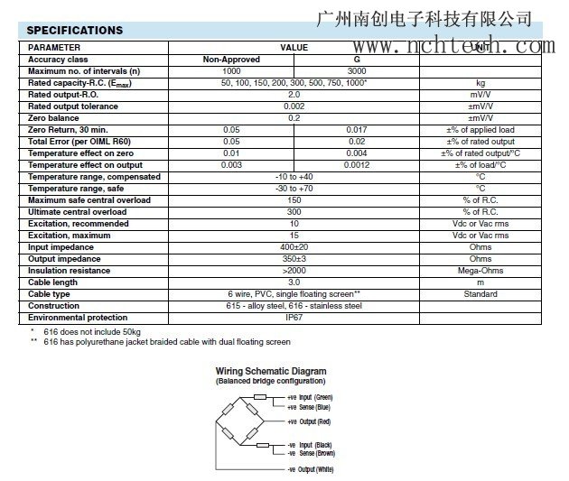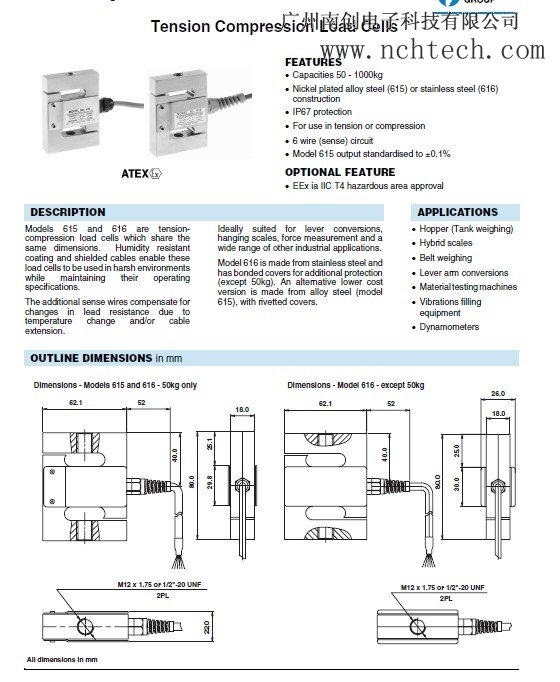 S 型(616)不銹鋼材質;防潮密封膠;量程(100~1000kg) ;綜合精 度:0.02%;防護等級:IP65/IP67;基本配件:M6001;用于機電結 合秤、皮帶秤、筒槽計量、測力系統(tǒng)、配料秤、定量系統(tǒng)。 616-1000kg 稱重傳感器電子版說明: 【廣州南創(chuàng)電子】傳感事業(yè)部培訓資料 型號 616-50kg 616-100kg 616-150kg 616-200kg 616-300kg 616-500kg 616-750kg 616-1000kg 用于拉伸或壓縮; 標準化輸出±0.1%; 線 6 (感 應)電路。AT0廣州南創(chuàng)電子科技有限公司