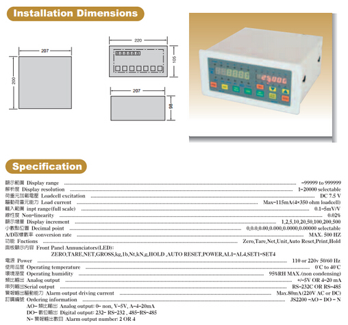 臺灣JIHSENSE JS-2200稱重顯示控制器規(guī)格圖:S6o廣州南創(chuàng)電子科技有限公司
