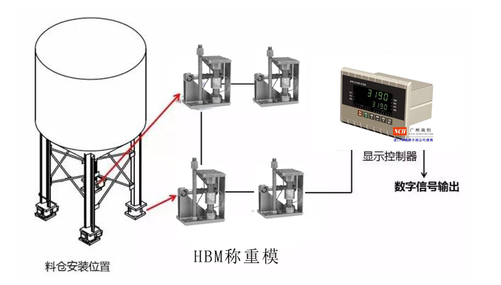 考慮到系統(tǒng)冗余,在100T料倉底部安裝4個40T容量的HBM稱重模塊,采用傳感器串聯(lián)法將信號送至顯示控制器,通過顯示控制器將信號輸出到指定的系統(tǒng)中。t6u廣州南創(chuàng)電子科技有限公司