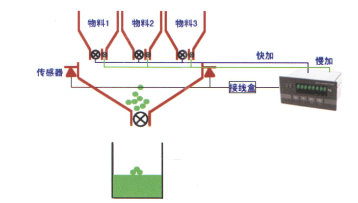 適合流動(dòng)性不好的物料,按實(shí)際排料量計(jì)量;秤斗不能太大,否則精度可能 不高;可在原有的儲(chǔ)料斗上直接改造;秤斗內(nèi)先裝滿物料,配料時(shí),控制器控制 卸料閥門打開,每次排出設(shè)定重量的物料;當(dāng)檢測(cè)到料斗內(nèi)剩佘物料達(dá)到下限 時(shí),啟動(dòng)輸送機(jī)結(jié)構(gòu)向料斗內(nèi)裝料,直接到上限值時(shí)停止。