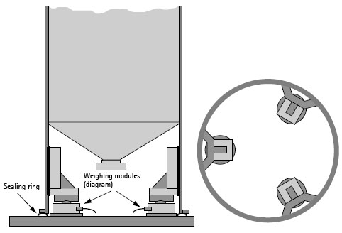 實(shí)踐中通常發(fā)現(xiàn)圓形立罐的外殼一般達(dá)到底部,以保證整個(gè)結(jié)構(gòu)的穩(wěn)定性,此時(shí)需要特殊的安裝方式正確地安裝傳感器。下圖顯示用傳感器來測(cè)量的這一結(jié)構(gòu)的原理,這一方案即通過它將重量導(dǎo)入傳感器。當(dāng)然稱重模塊也包含抬升保護(hù)。即使結(jié)構(gòu)的小的抬升已足以使整個(gè)重量導(dǎo)入傳感器。所以在此結(jié)構(gòu)中需要一圓形密封圈來密封,它非常柔軟不足以產(chǎn)生附加力。MJT廣州南創(chuàng)電子科技有限公司
