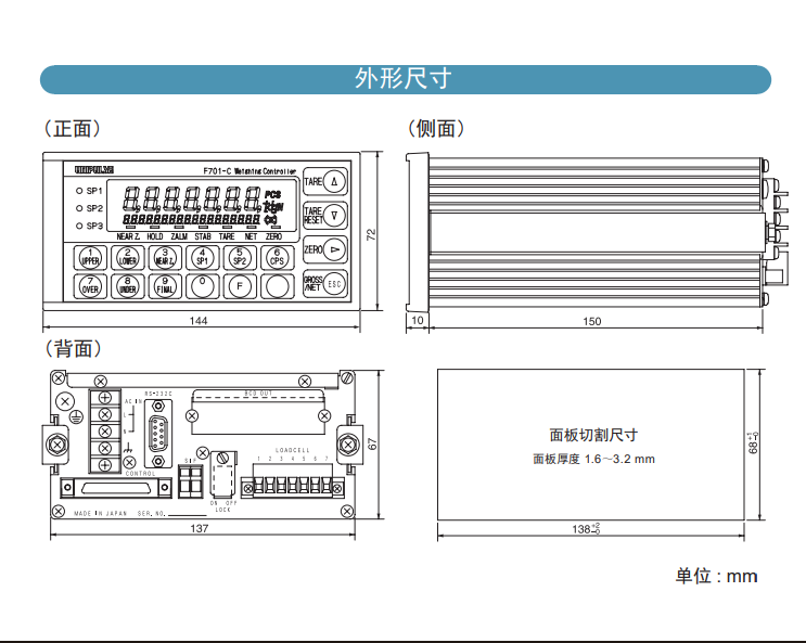 日本尤尼帕斯稱重顯示控制器F701-C產(chǎn)品尺寸圖:YnU廣州南創(chuàng)電子科技有限公司