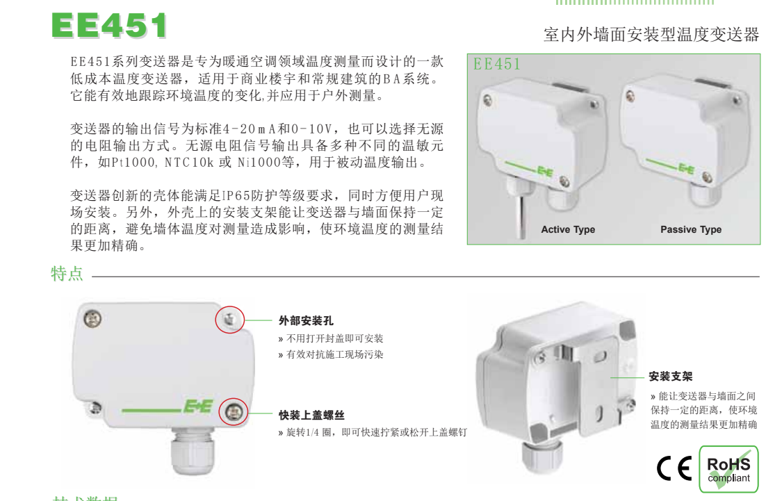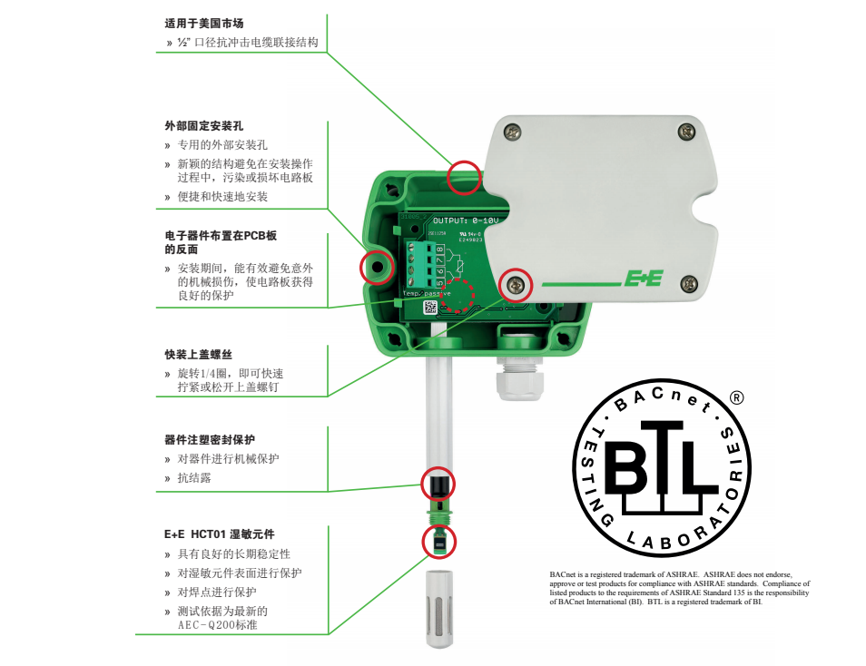 奧地利E+E全系列溫濕度傳感器,ee451系列溫濕度變送器是由奧地利益加義公司專為HVAC系統(tǒng)設(shè)計開發(fā)的全新系列產(chǎn)品。ee451系列變送器具有高精度、低成本的特性,是測量空氣相對濕度和溫度的理想儀表,能為用戶提供可靠的溫濕度測量解決方案。優(yōu)秀的品質(zhì)及全新設(shè)計的產(chǎn)品外殼,最大程度地降低了安裝成本,減少了現(xiàn)場的工作量,提升了產(chǎn)品抗污染、抗凝結(jié)的性能,從而保證其在工作過程中將誤差降低到最小程度。ee451系列產(chǎn)品采用了最新的E+E生產(chǎn)的HCT01敏感元件,具備更好的長期 ee451 穩(wěn)定性和抗污能力。結(jié)合了多年的校準經(jīng)驗,ee451的測量精度可以達到±2.5%RH,具有電流(mA)、電壓(V)和數(shù)字通訊三種信號輸出方式?,F(xiàn)場安裝分為墻面安裝和風(fēng)管安裝兩種方式。U3s廣州南創(chuàng)電子科技有限公司